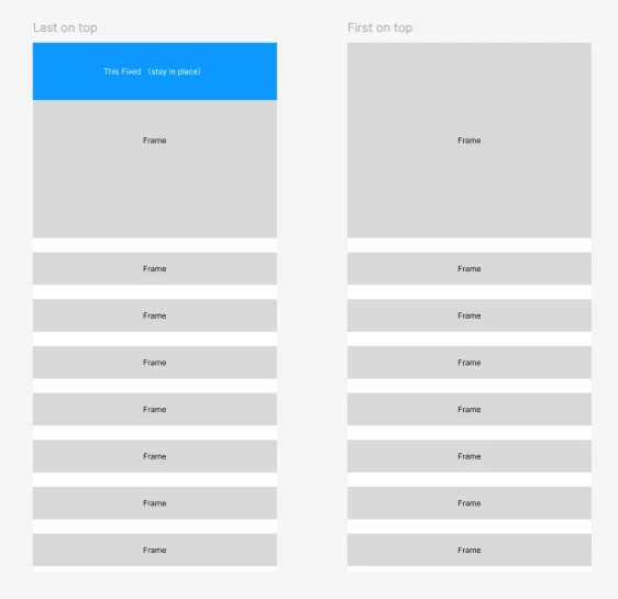 On the right side, the “First on top” setting is applied, so “Frame 3” appears above the “Fixed” frame.