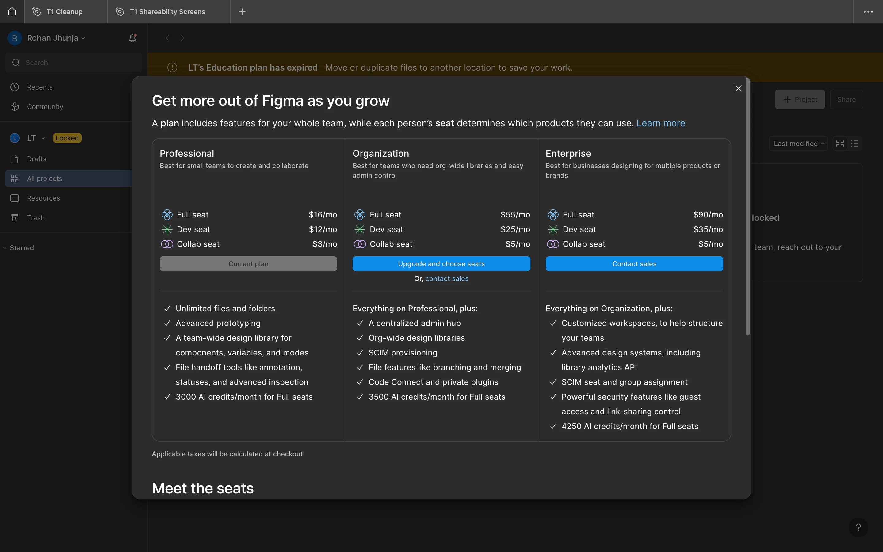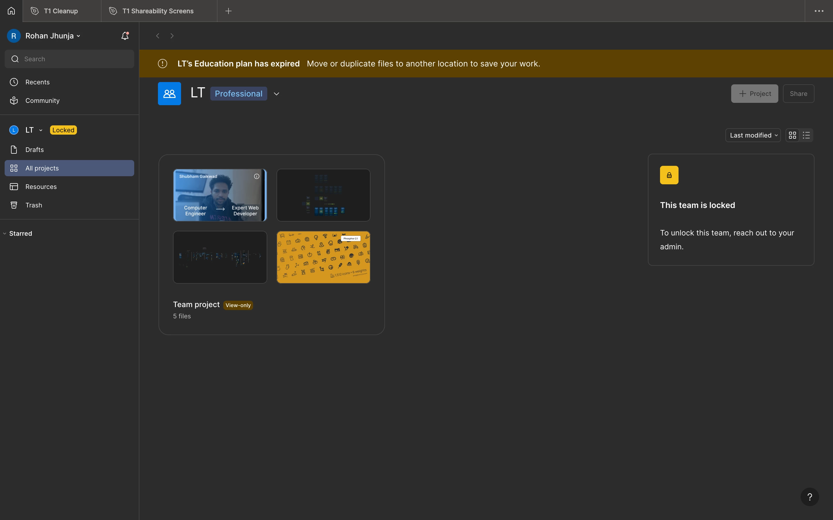 Hey Rohan, thanks for reaching out and sharing the screenshots! I understand how concerning this is, especially if you’ve already paid for a Professional plan and your team files are now locked. This usually happens when you have an outstanding invoice but I’d like our team to investigate further as I am not sure why the Education plan notification appears here.