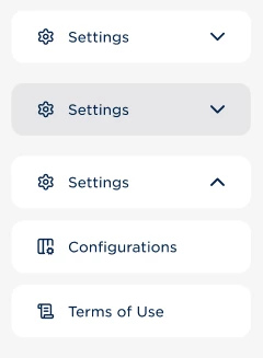 Now, When I hover over the settings button, I want it to turn into the grey mode and when I click on the grey button (Hover state), it should open up to reveal other two options (Configurations and Terms of use). This action works fine like how it is intended.
