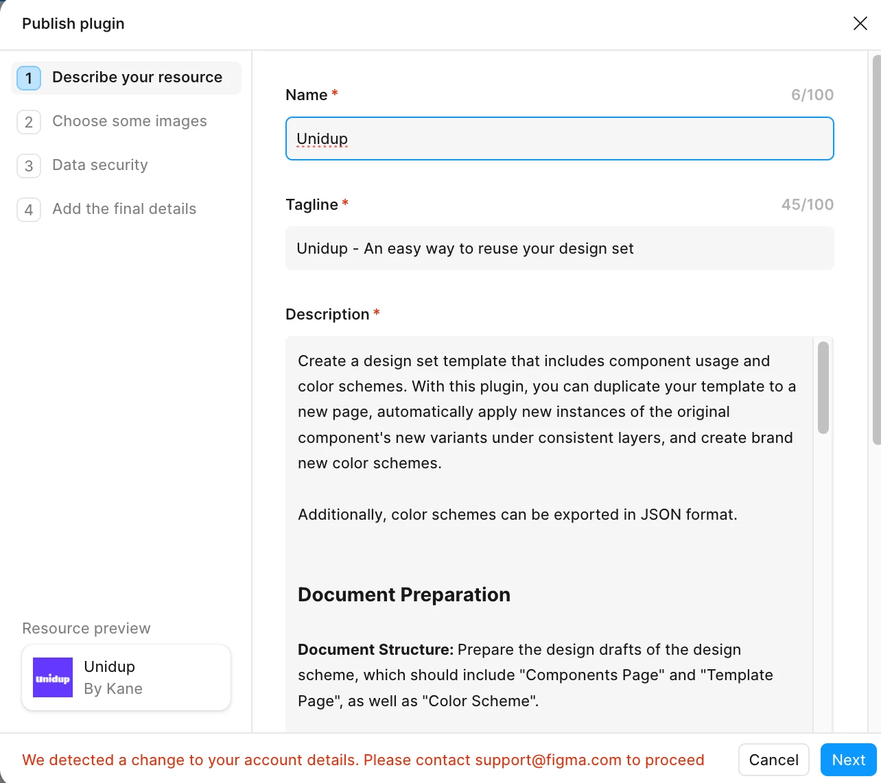 I found an issue when publishing new version of plugin Unidup – Figma, like:
