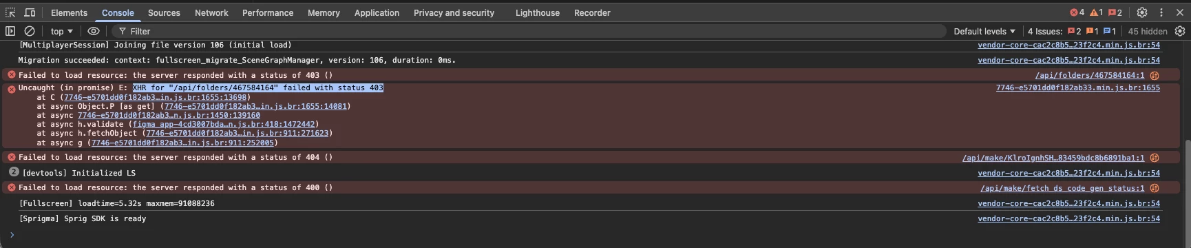 The figma parts of the page load but then it fails to load the rest of the page. I have permissions to the page. Here is the full console error from Chrome.