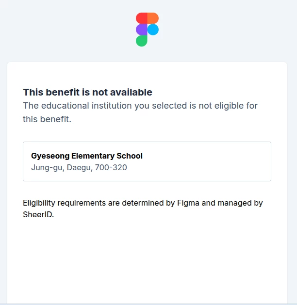 This message appears before any documents are reviewed, which suggests that my school is currently marked as not eligible in the SheerID / Figma eligibility database.