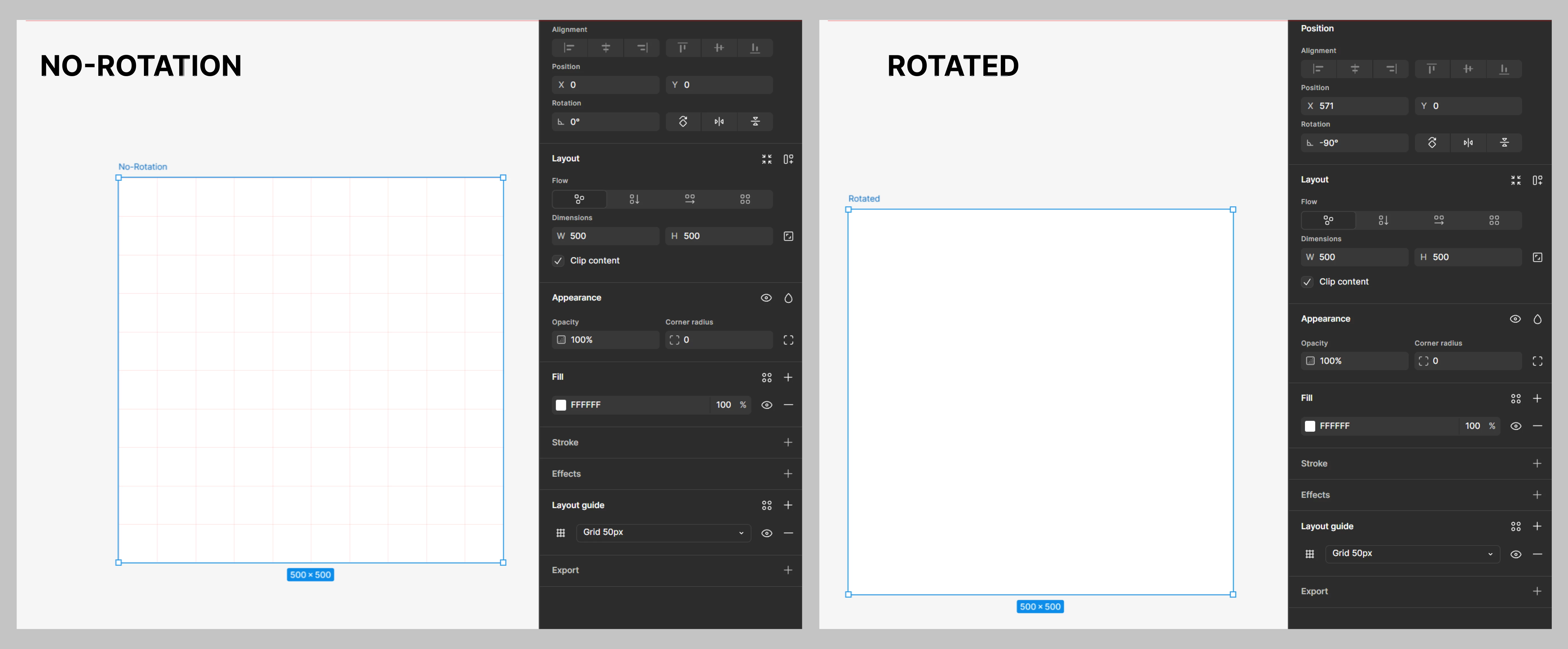 The Layout Grid overlay disappears immediately after applying any rotation value (e.g., -90°) to a Frame