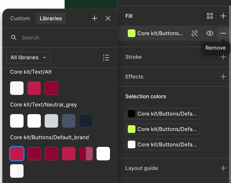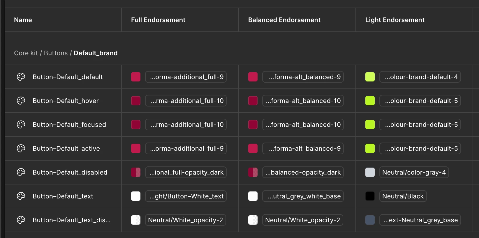 When switching between variable modes in Figma (e.g., Balanced Endorsement, Light Endorsement, Full Endorsement), colours applied to components (e.g., buttons) do not update correctly. Some elements retain the wrong colour despite the linked colour updating correctly.