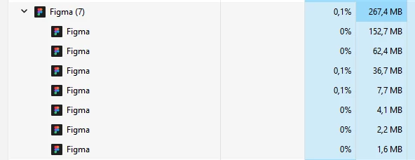 although Figma App has been closed and no Broswers is running (there should be no Figma App running on the desktop) it still consumes a lot of memory (0.25GB !)