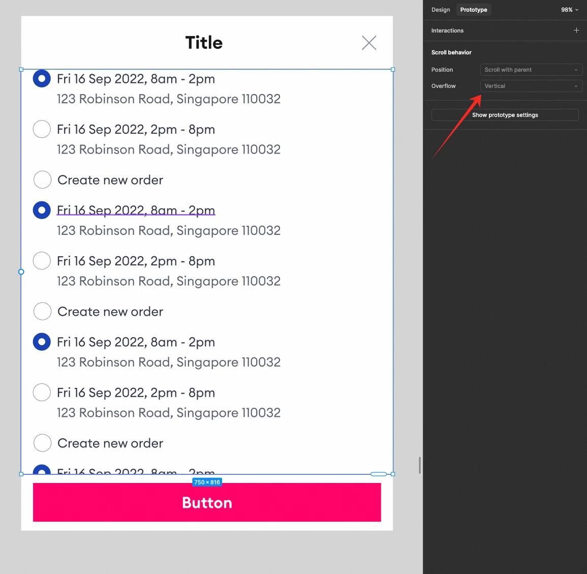 There content is bigger than the frame, but can not select the overflow under “Slot”.