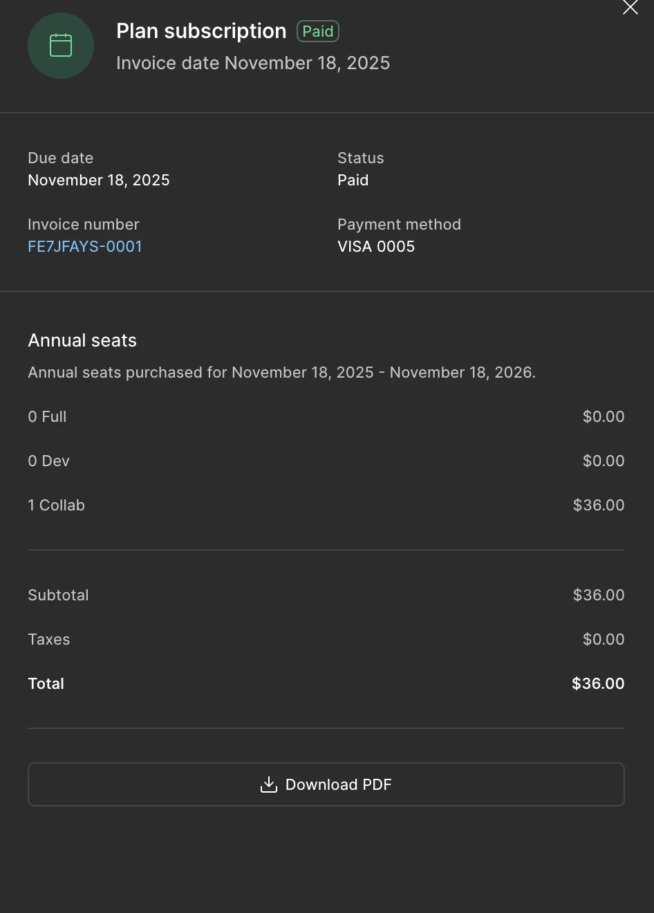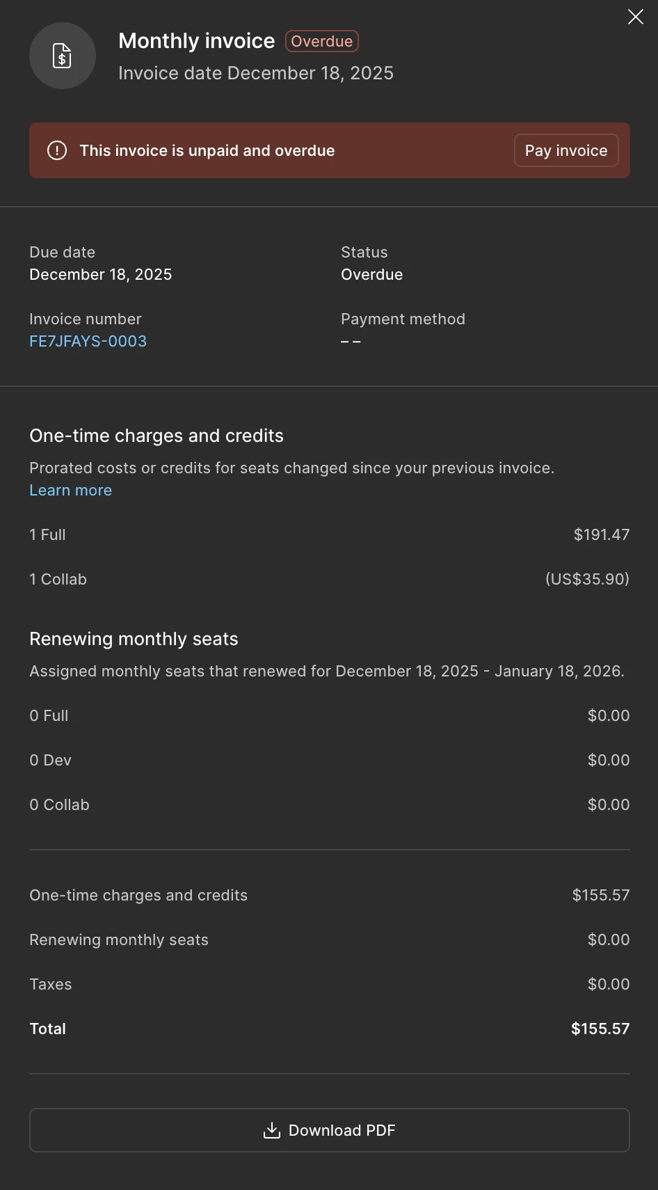 I paid for an annual plan with one professional seat but my file has been locked and it says I have an overdue invoice. Please help me understand what’s wrong here. Sharing two screenshots