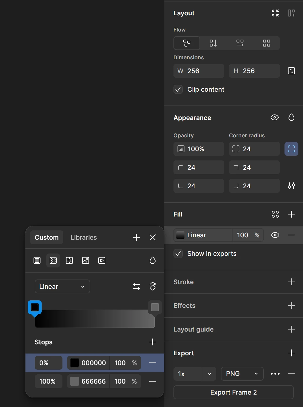 Png exports have weird dithered gradients and no option to export in 10 bit. I have to resort to exporting pdfs, because exporting smoothed corners as an svg deletes smoothing.