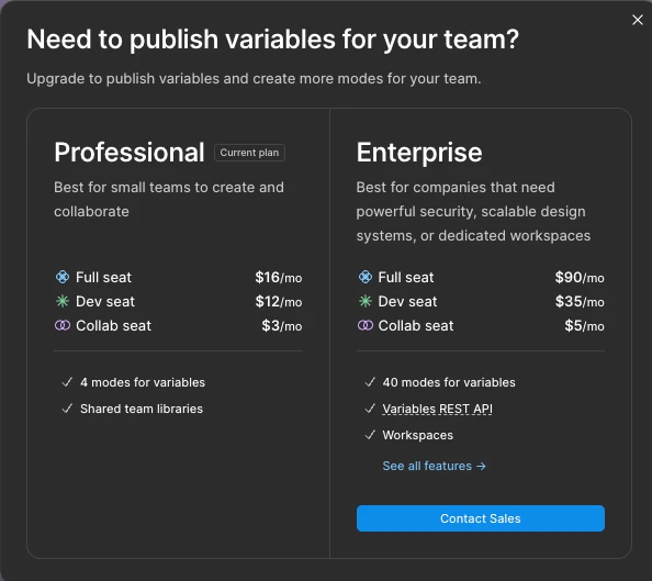 To clarify a prompt to upgrade to Enterprise when publishing a library is often related to the number of variable modes exceeding 4 modes. As currently, only the Enterprise plan can use up to 40 variable modes as detailed in our pricing page here.