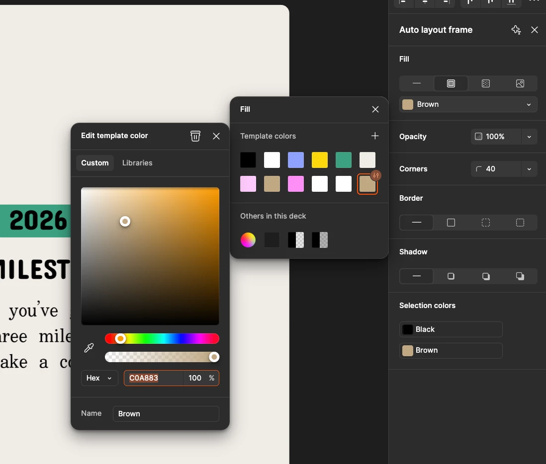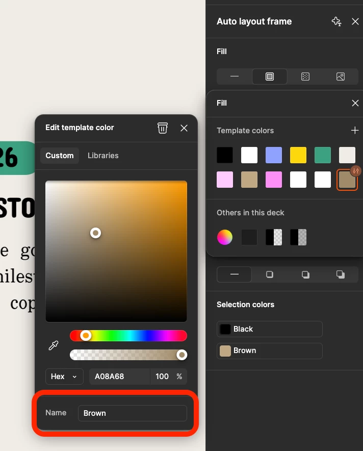 - For example, when you click on a color style (see screenshot below per example, I edit with a brown color), it will replace the currently selected color in your template with that one. To change the actual color value itself, you’ll need to use the “Edit template color” option.
