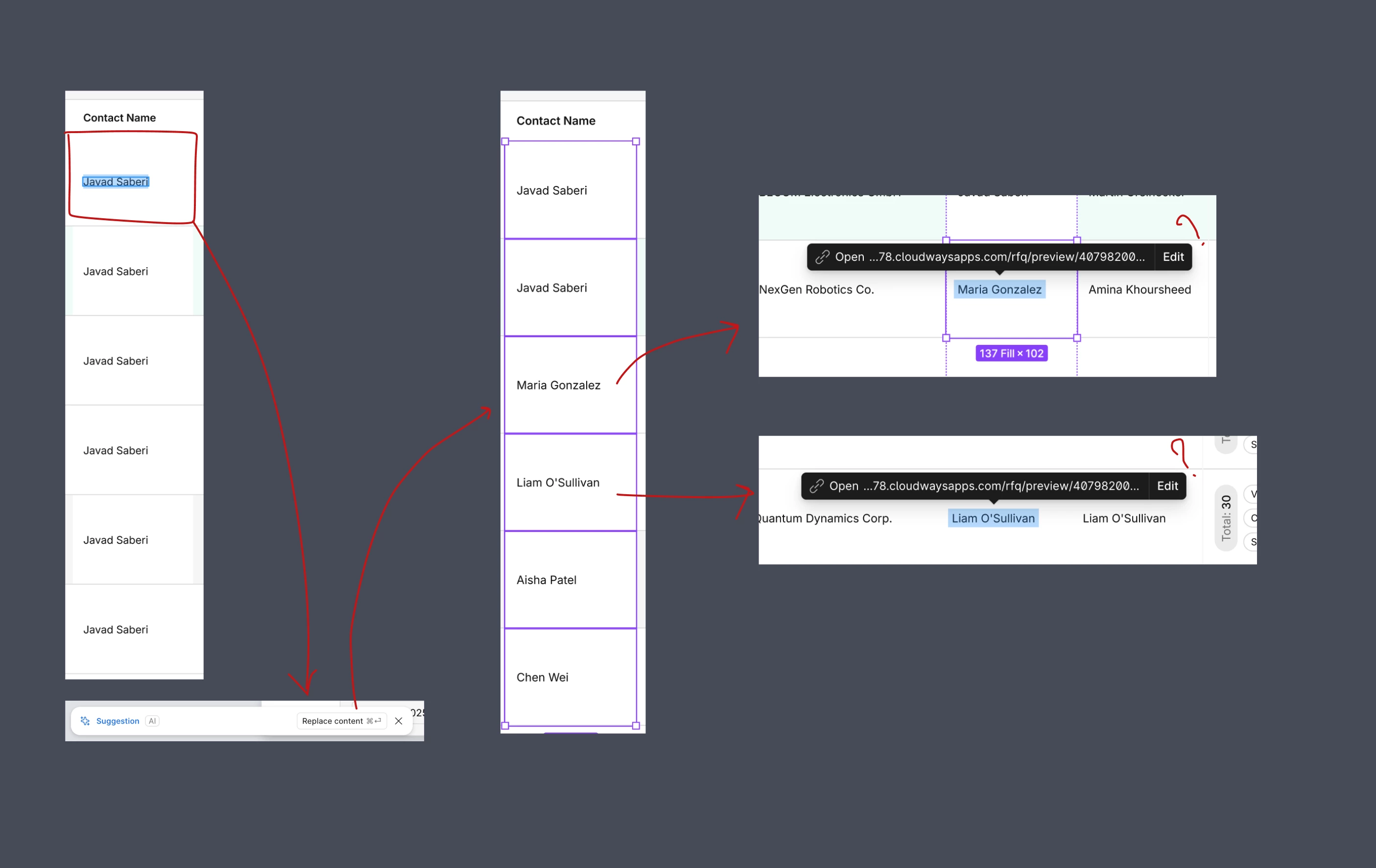 In a table column, when I insert a cell and duplicate it across other cells in the same column, after pressing the Replace Content option, it not only changes the name but also adds an empty link to it.