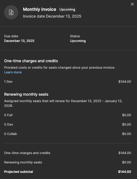 I accidentally added an extra annual Developer Seat to my workspace. The seat is billed as a 1-year subscription ($144), and the charge has been added to my monthly invoice, scheduled to be billed on December 13.