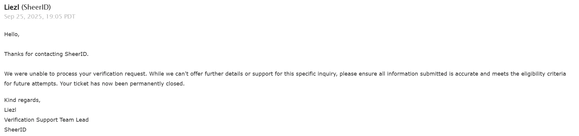 SheerID’s support did reply (and I genuinely appreciate that their support staff were polite), but they just reset the process and asked me to try again — which, of course, led to the exact same problem.