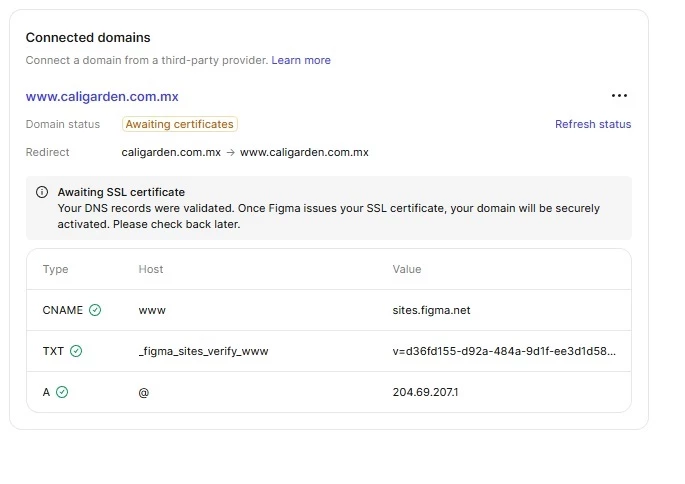 Our domain was connected with FIGMA and everything was working. We made a DNS change to implement weglot.com and it broke the FIGMA connection. We deleted all the DNS records, removed the domain from FIGMA and set it up again. All the DNS records were updated properly and the green checks were beside the CNAME, TXT and A records. Waiting over 24 hours and no SSL.