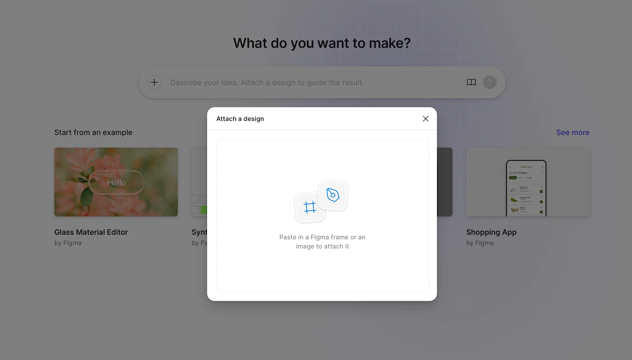 Based on feedback, we’ve replaced it with a new flow where you can paste Figma frames or drag and drop images to attach them directly to your Make.