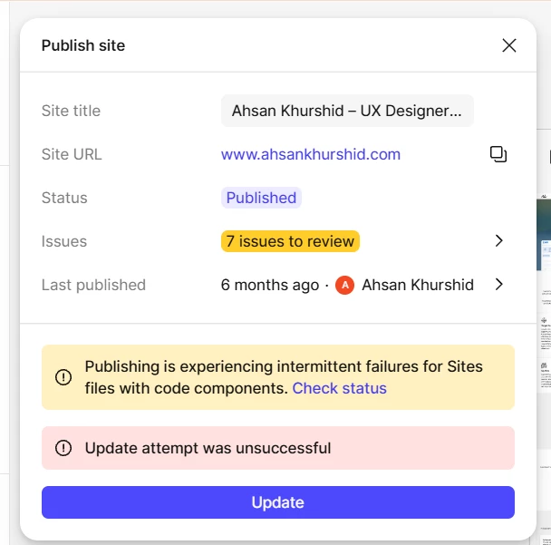 I am trying to update and publish my Figma site created 6 months ago but I am getting below errors.