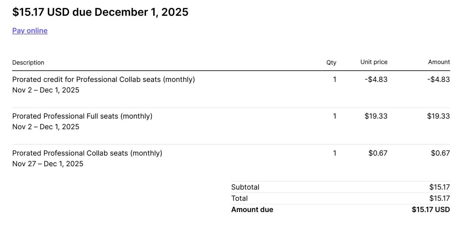 However, on December 1st I received an invoice for $15.17 USD, and my bank showed an automatic payment attempt from Figma. I previously paid only $5 USD for my plan, and I did not add any extra seats.