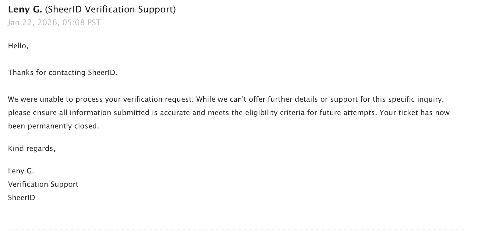 If you haven’t already, please reach out to them directly and let them know what’s happening using this secure form: Contact SheerID Support. Their team is now better equipped to review your case and provide next steps.