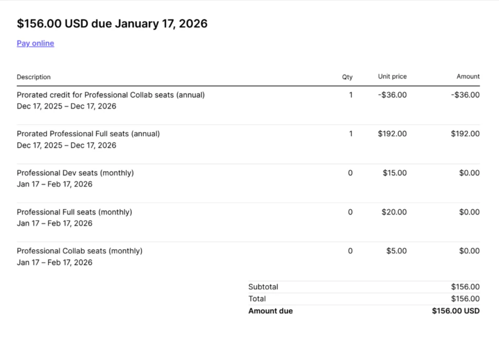I had an annual subscription of Collaboration Seat valid till December 17, 2026. Today I found a due bill of an annual full seat. My question is how did that upgrade without my approval?