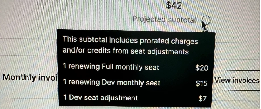 I have paid two full seat last month, and want to downgrade one seat to Dev seat from next billing cycle. However, there is ‘Dev seat adjustment’ fee in the projected subtotal. What is this fee? Should I pay extra $7 to downgrade the seat? It does not make sense to me.