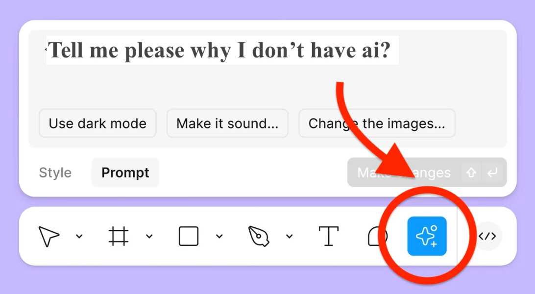 I’m on the free Starter plan and don’t see any Figma AI features (no magic wand, no AI options like First Draft, Generate, Edit with prompt, Remove background, Vectorize).