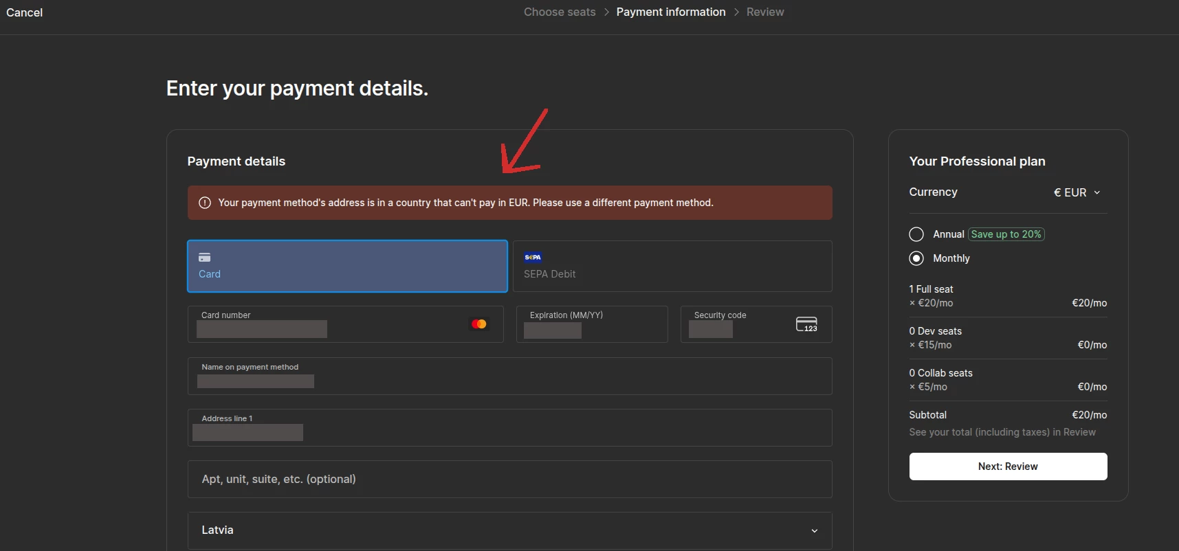 I am trying to subscribe to Figma Pro plan from Latvia (EU & Eurozone country) but Figma shows me this at the checkout: