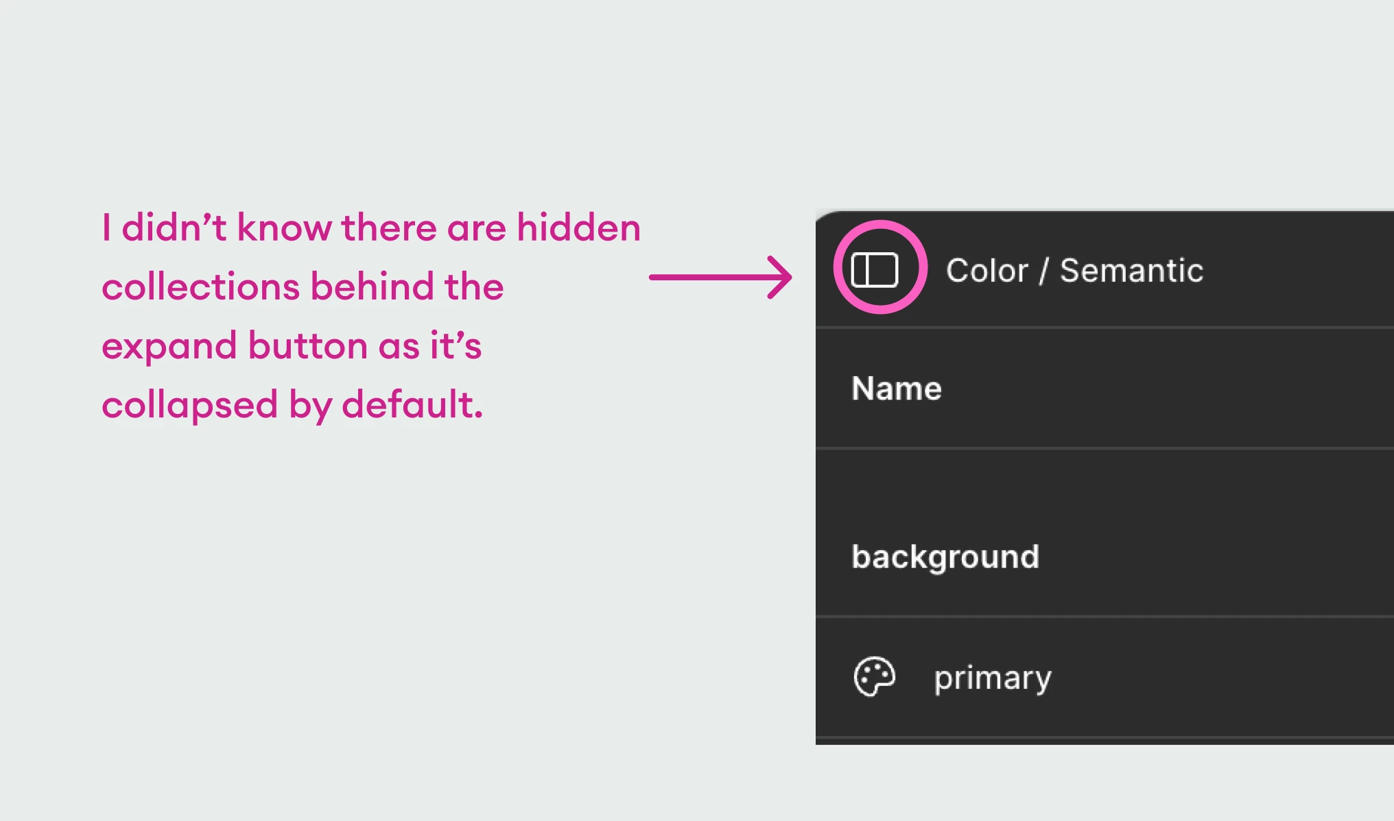 It took me a few minutes to find hidden collections. It’d be great to add more affordance somewhere so that a new team member knows there are hidden collections under “Variables” window.