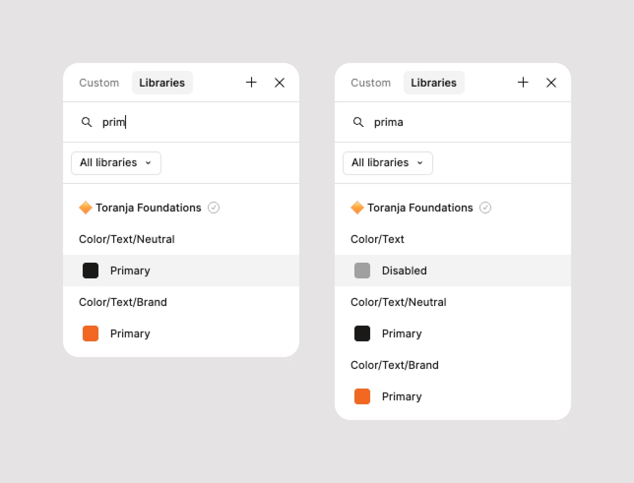 Figma's latest color tokens search update has added a new behavior to searching. I use my Primary token a lot, and I'm used to searching for "prima" for it to show up. Since this last update, searching for that makes my Disabled (#AAAAAA), token show up first, due to it having "A" in it's hex color code.