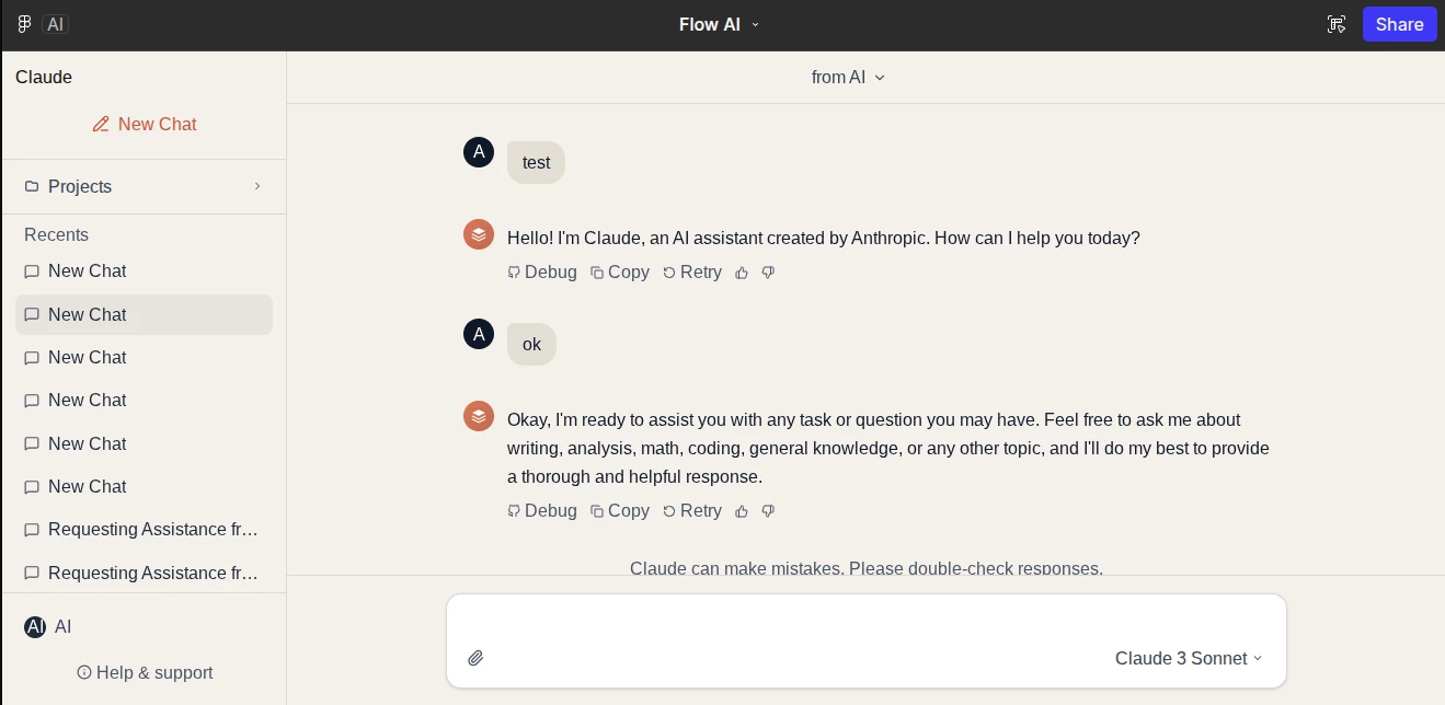I tried making an AI called “Flow” by having the AI design the basic UI and the basic code and asked it to be inspired off of CluadeAI. I asked the AI multiple times, and it kept on pointing out its mistakes over and over again. This was very poor work and I was kind of angry and frustrated that Figma markets it so well but then asks you for credits. Here is a screenshot I sent it.