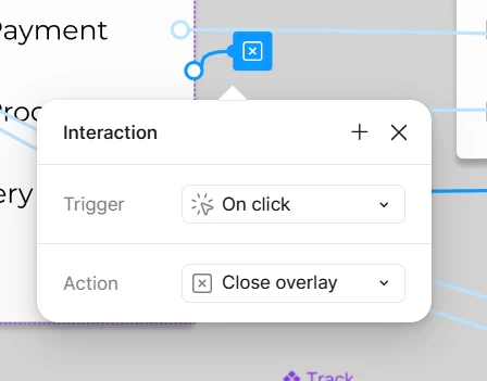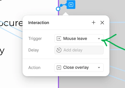 After linking my dropdown button to the content I wanted using (mouse enter effect), I clicked on the add interaction on the content body, dragged it to the close overlay, changed the ‘on click action’ to ‘mouse leave’