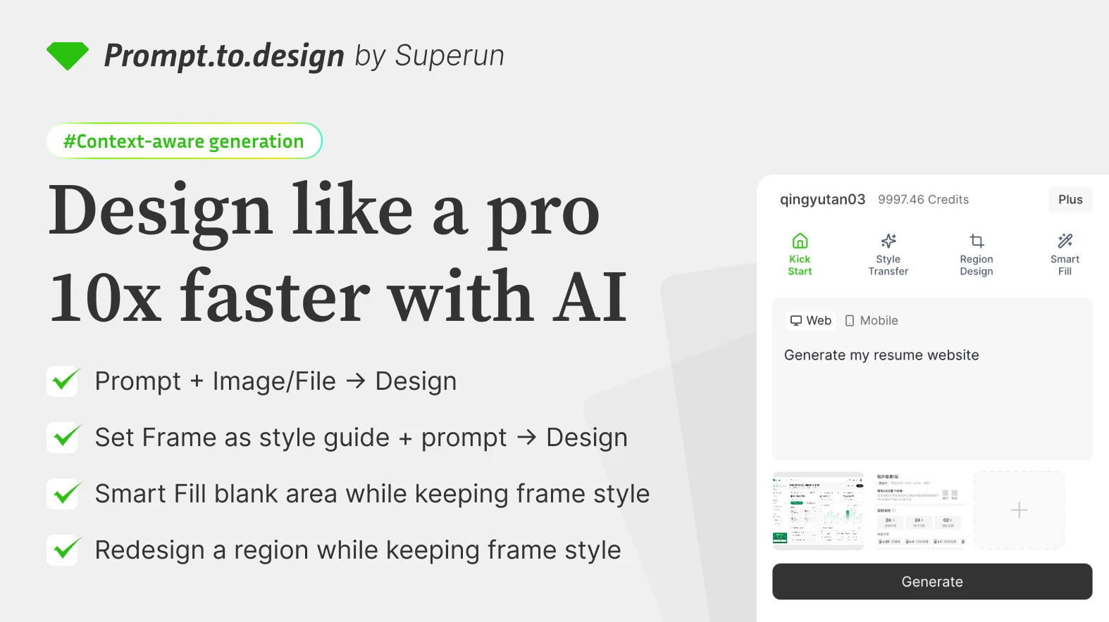 Design 10× faster by combining prompt + images + your frame’s existing style.