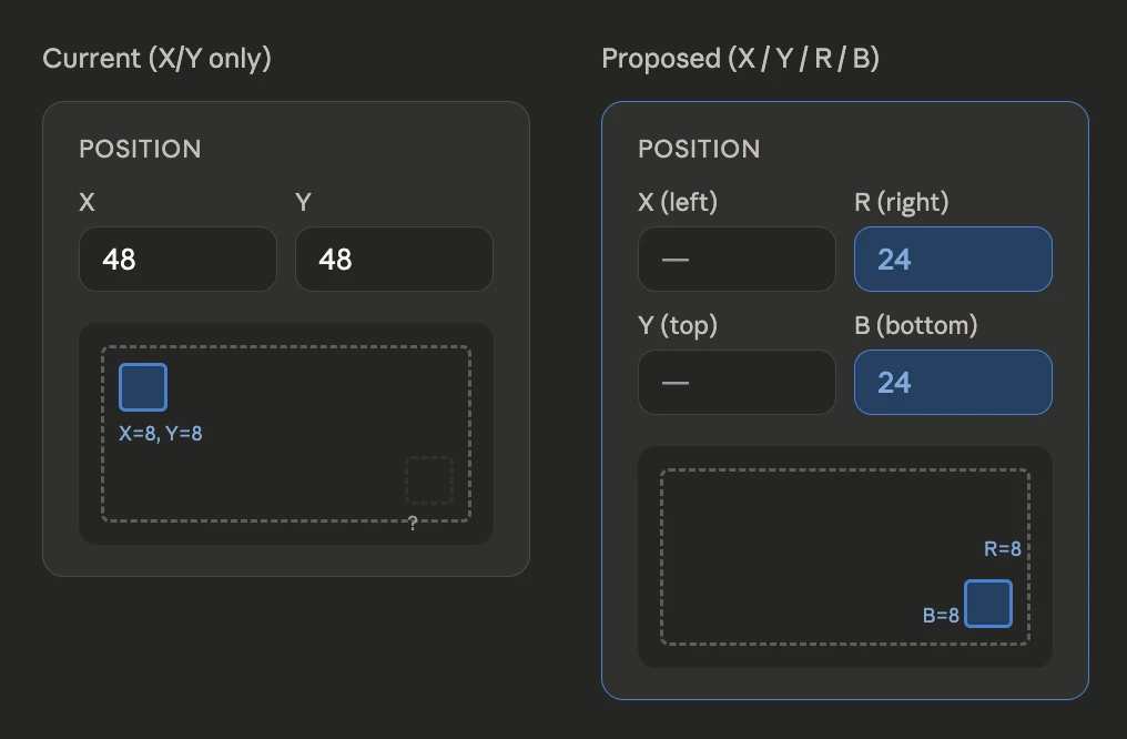 Figma's X/Y system always measures from the top-left. This works perfectly for positioning elements near the top or left edge, but becomes a friction point when working from the bottom or right. To place a square 24px from the bottom-right corner, I have to manually calculate the values or use a dummy reference object as a workaround - every single time.