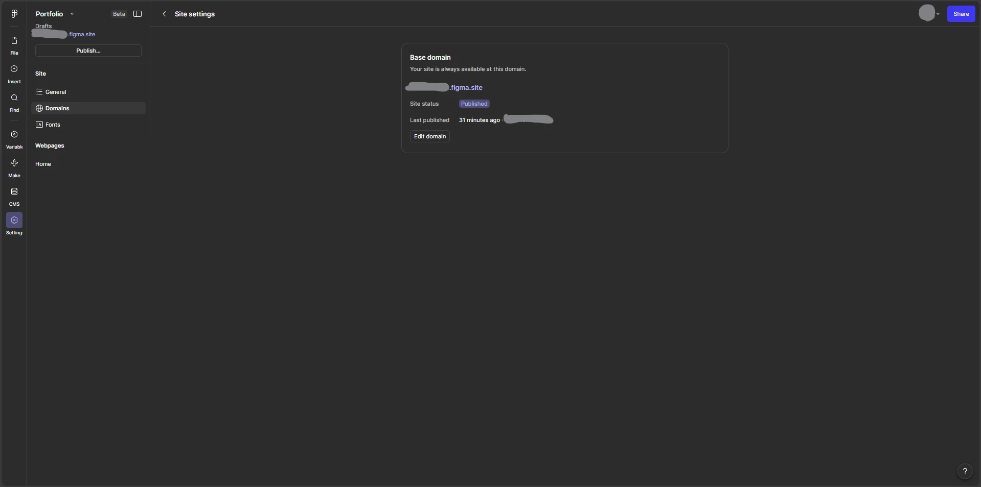 Hello, I just discovered Figma Sites and wanted to create a Portfolio, however I cannot find the option to publish it and connect it to my custom domain. On the website and on youtube, everyone seems to have an option to add connected domain in the Site Settings under the Domain menu, however the menu for me consists of just Base Domain menu. (See screenshot)