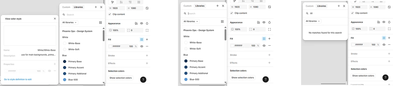 When aligning older files with a new design system, designers often copy a hex from the canvas and expect the matching style to appear in search — but it doesn’t.