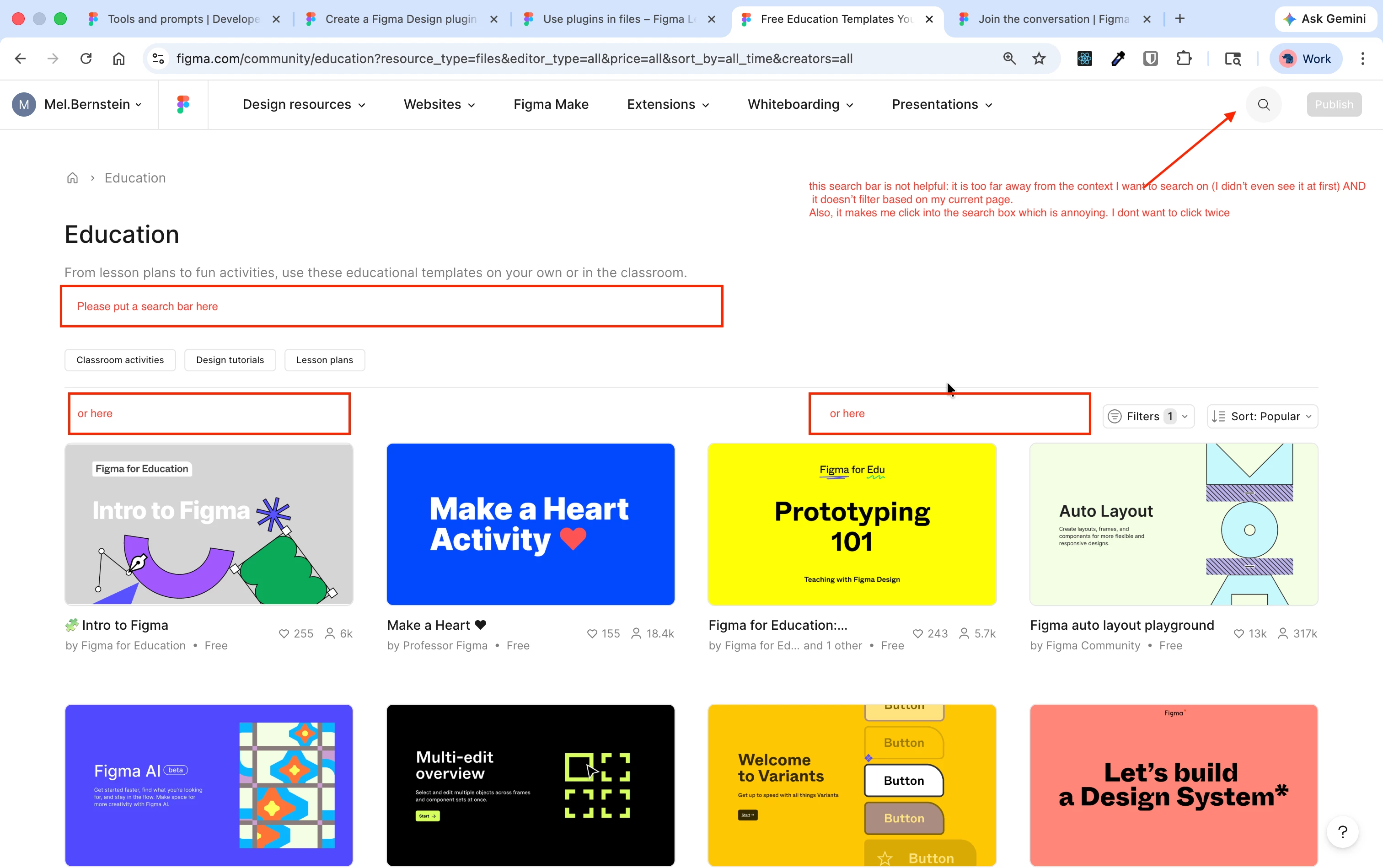 On this page https://www.figma.com/community/education, I would like to have a search bar below the description for Education or on the same level as filters. There is a search bar in the top right corner of this page, but it doesn’t filter the content on my current page.