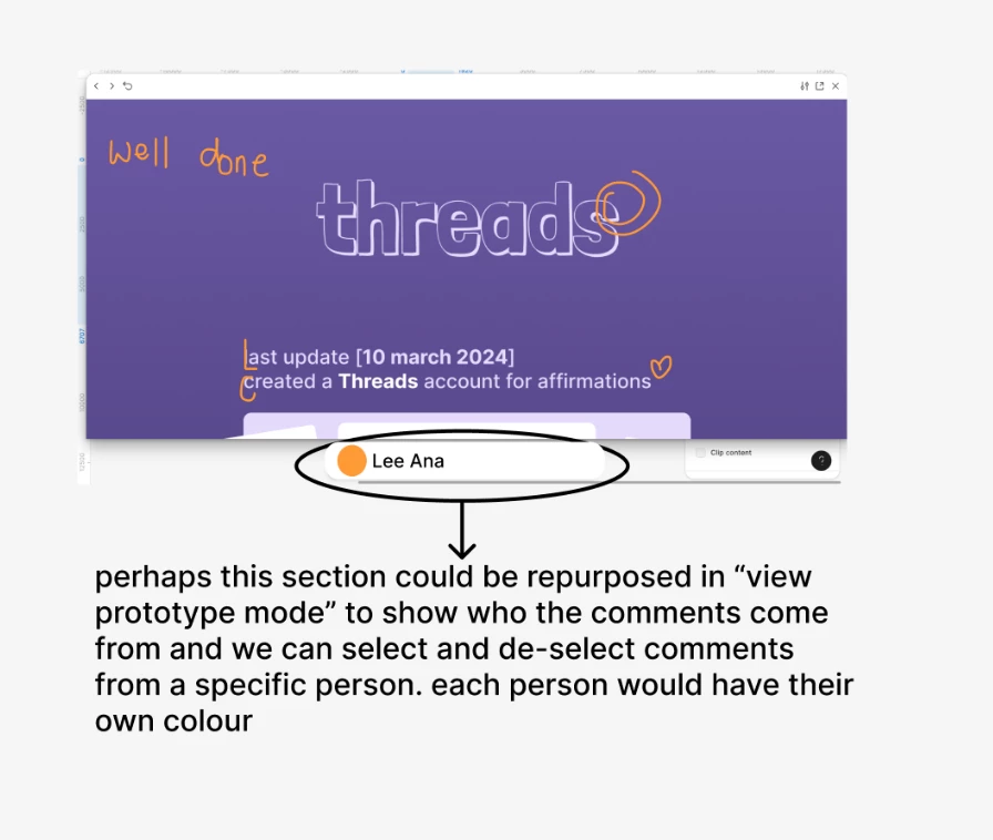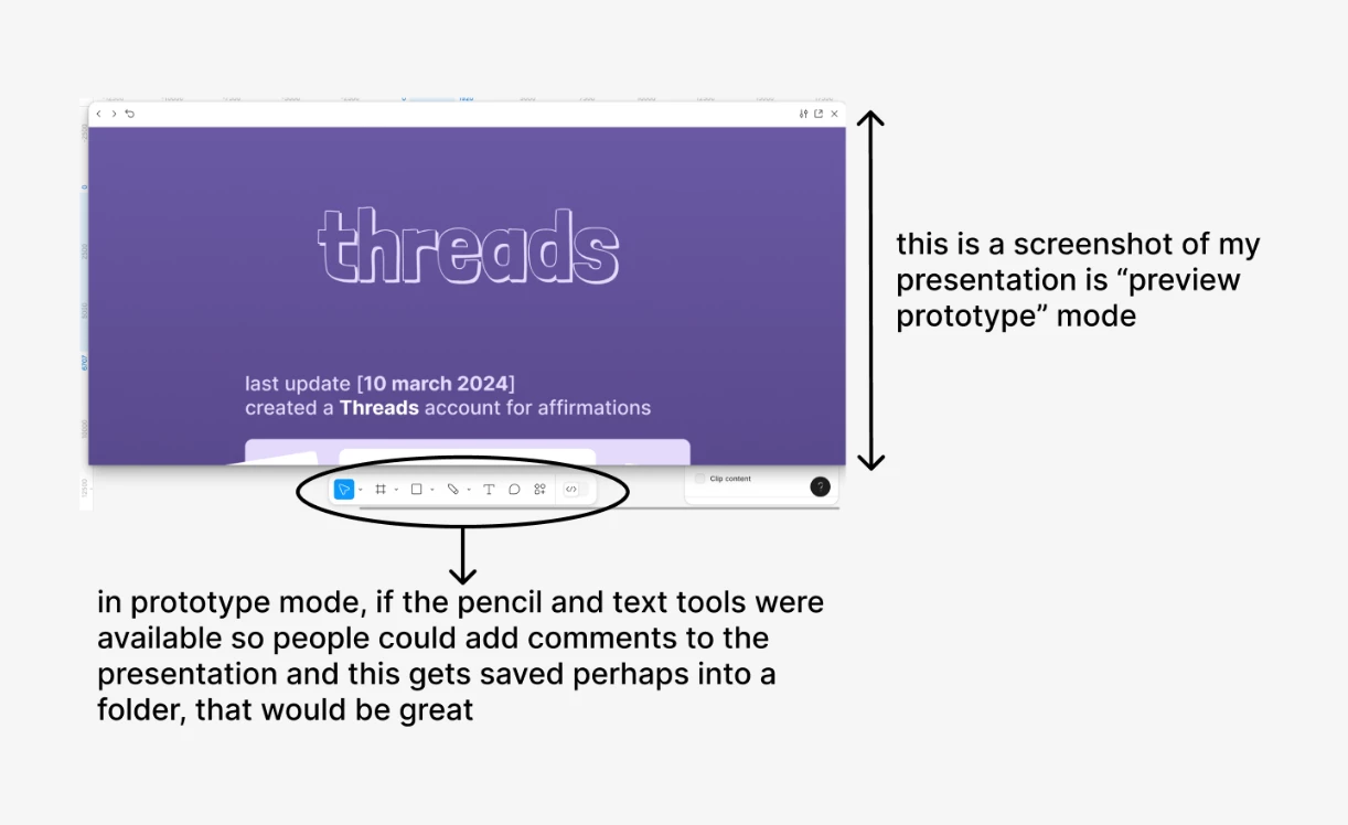 my suggestion is about when we’re in prototype mode. I would love the ability to draw onto the designs without changing the designs and leaving comments using the pencil tool - maybe even writing as well. I attached screenshots of a super simple concept of the idea (for one person commenting on the slides). thank you to the figma team for such an awesome tool. also; much love to all, xo