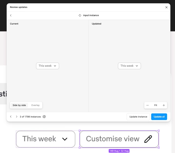 I work with a big screen (And I believe a big portion of folks using Figma as well) and one thing that frustrates me a lot is the fact I cannot resize the “Review updates” window. The current size works fine with smaller components (Like atoms) but when things start to get more complex, and bigger, it fills kinda claustrophobic to review a component in that small window with so much screen real state available around… I mean, look at all this space around the modal…