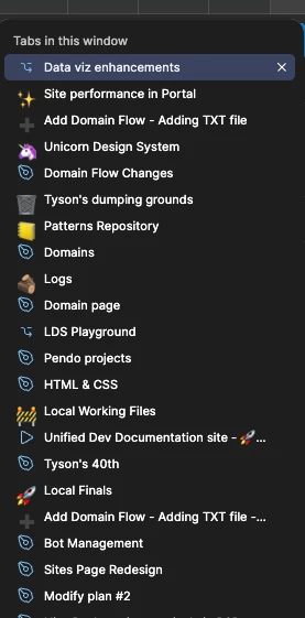 Sometimes when too many tabs are open, their names are getting truncated and it would be quite difficult to jump from one tab to another. E.g. tracing a component back to design system to check master component and documentations before jumping back to working file, it would take some time to locate where the working file tab is.