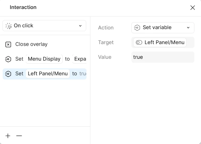When adding a conditional on click interaction in Figma, the boolean only switches the variable on/off and there is no option to smart animate the boolean variable.